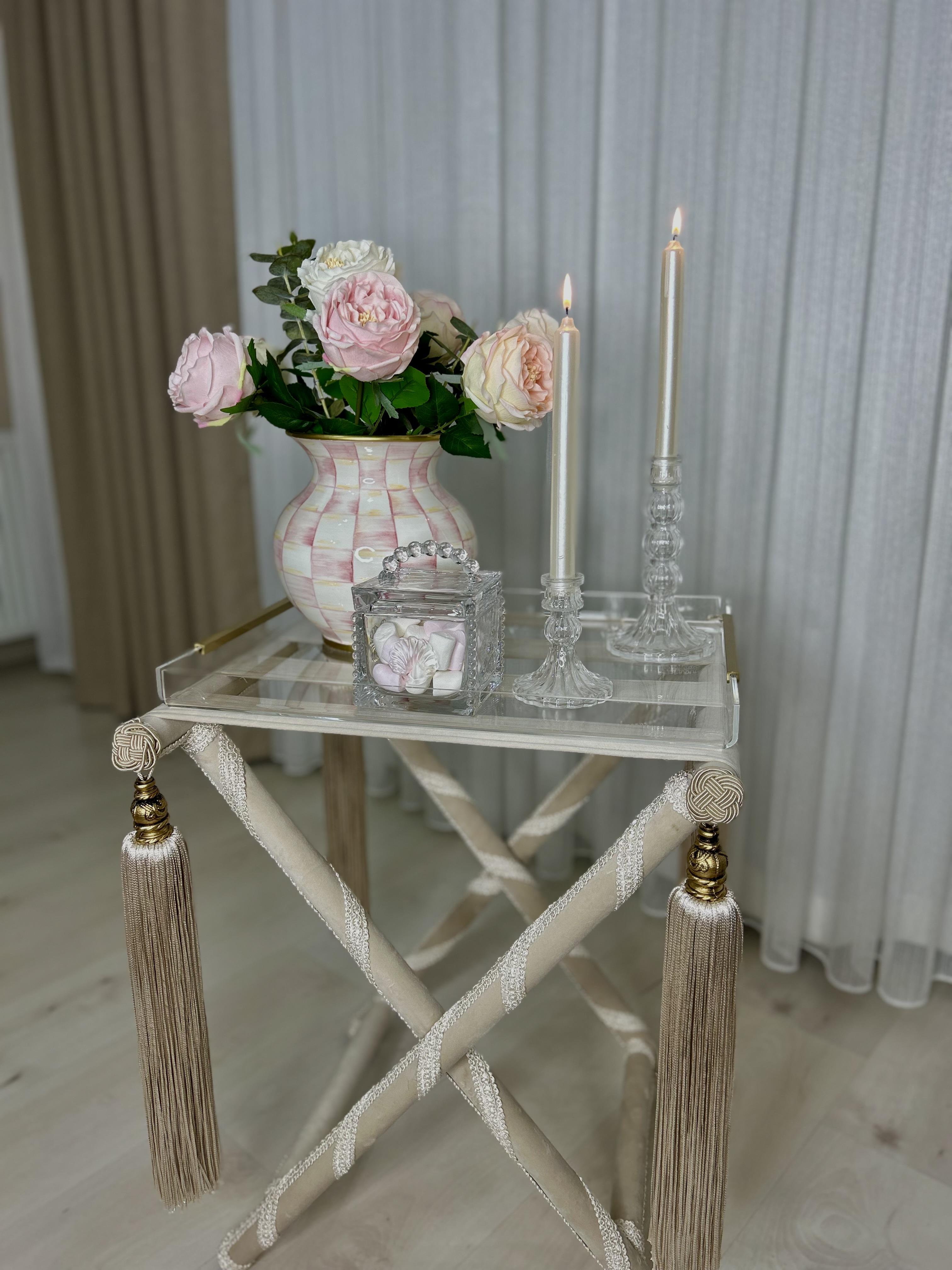 Krem katlanabilir kadife sehpa tepsili